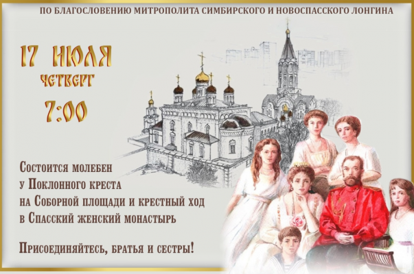 Симбирская епархия сообщает, что в Ульяновске 17 июля, в день памяти святых Царственных страстотерпцев, будет проходить молебен у поклонного креста на месте разрушенного Николаевского собора на Соборной площади.