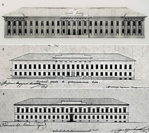 Главным фасадом здание ориентировалось на Север. Он олицетворял холод, мрак и невежество, которому противостал «храм просвещения». По проекту центр фасада венчался щитом с императорской короной и монограммой Екатерины Второй, желавшей войти в историю как просвещённая монархиня.