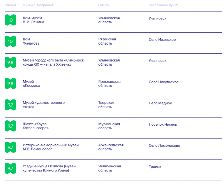 Максимальную оценку — 10 из 10 баллов — получили два музея: Дом-музей В. И. Ленина в Ульяновске и дом Филатова в селе Ижевское Рязанской области. Некоторые назвали исторический квартал со старинными домами и музеем Ленина в Ульяновске причиной вернуться в регион.