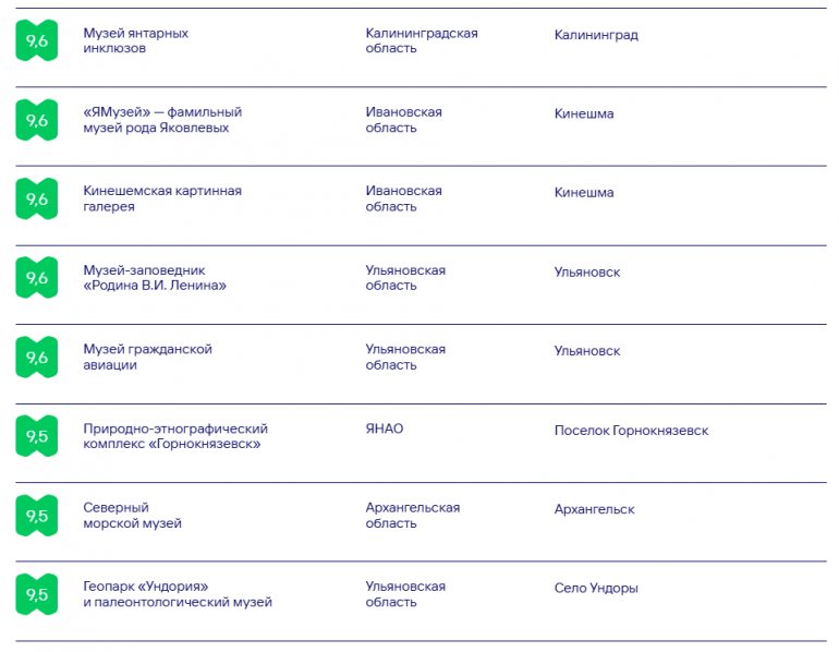 На второй строчке рейтинга расположились музеи, которые получили оценку 9,8 балла из 10. Это ульяновский Музей городского быта «Симбирск конца XIX — начала XX века» и музей «Космос» в селе Никульское (Ярославская область).