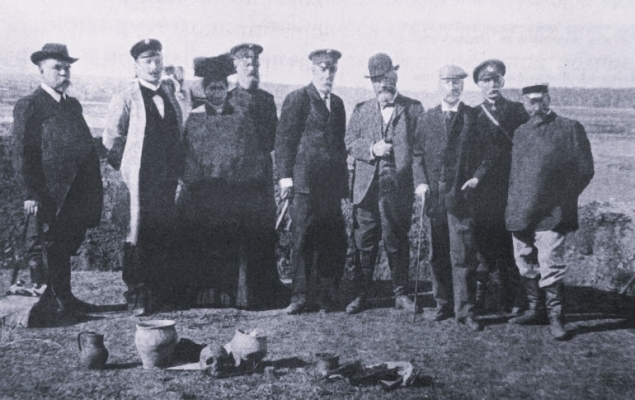 Губернатор Акинфов, Владимир Поливанов и барон де Бай, в кепи и с тростью, на раскопках Муранского могильника. 1895 год: