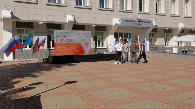 Возле входа в областную библиотеку установили площадку, где проходил фестиваль национальных культур. Ведущий зазывал ульяновцев принять участие в мастер-классе.