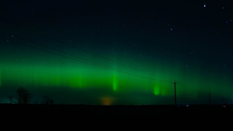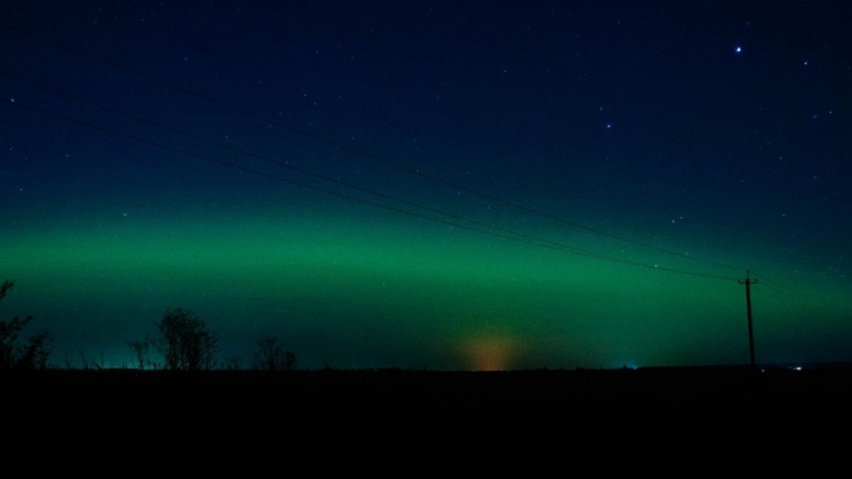 Атмосферные фото получились на подъезде к селу Криуши. Правда автор сетует, что нужно было ехать в сторону Старой Майны или Ундор, там всегда сияние ярче.