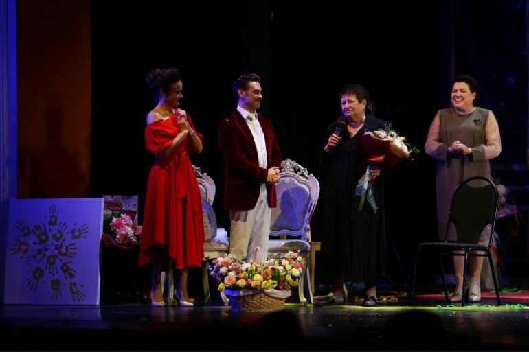 На сцене не появилась ведущая актриса улдрамы Оксана Романова. Она радовалась за коллег-бенефициантов из зрительного зала, оставив за занавеской у входа в зал… костыли. Недавно Оксана поскользнулась на улице и теперь ходит в гипсе от икры до ахиллова сухожилия. При этом выходит на сцену в тех спектаклях, где можно появиться с тросточкой на заднем плане.