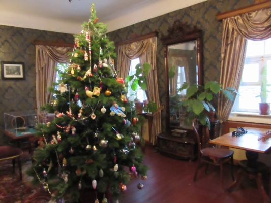 На ёлке, установленной в гостиной музея, представлены игрушки 30-х — 80-х годов 20 века, выполненные из картона, стекла, папье-маше. Каждая обладает своей историей.