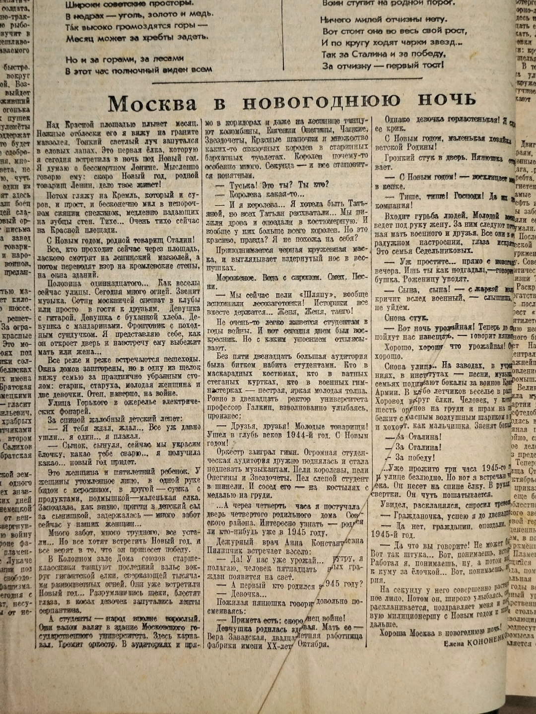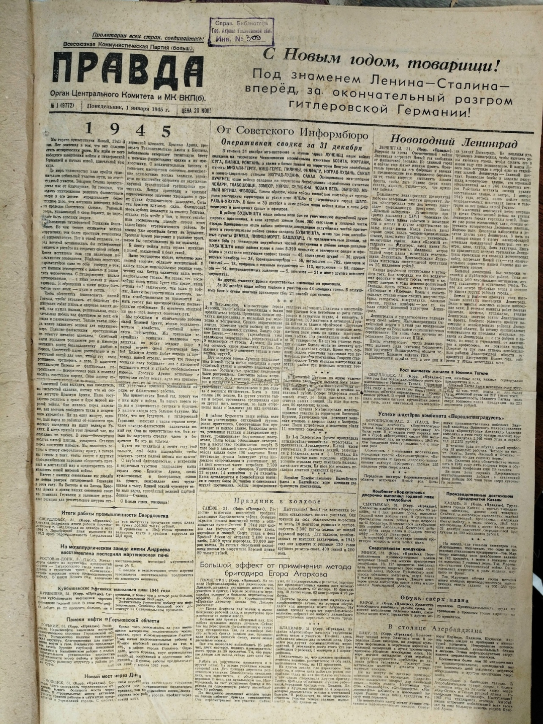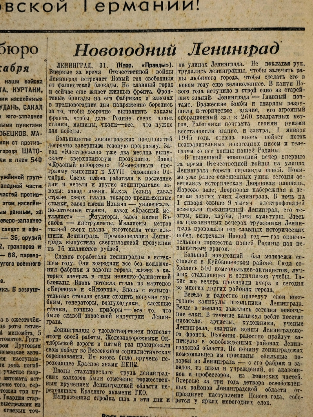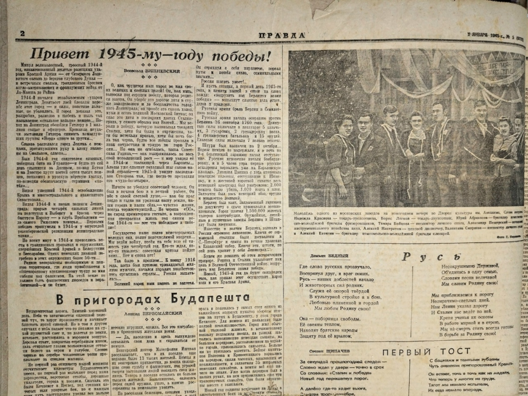 И с каждым годом их вера становилась всё сильнее! Новый 1945-й стал самым счастливым, потому что встретили его уже в ожидании великого торжества — окончания войны. На страницах газеты «Правда» от 1 января 1945 года читаем: «Мы горячо приветствуем Новый, 1945-й год. Нет сомнения в том, что ему суждено стать историческим годом. Мы ждём от него победного завершения войны с гитлеровской Германией и начала новой длительной эры мира...».
