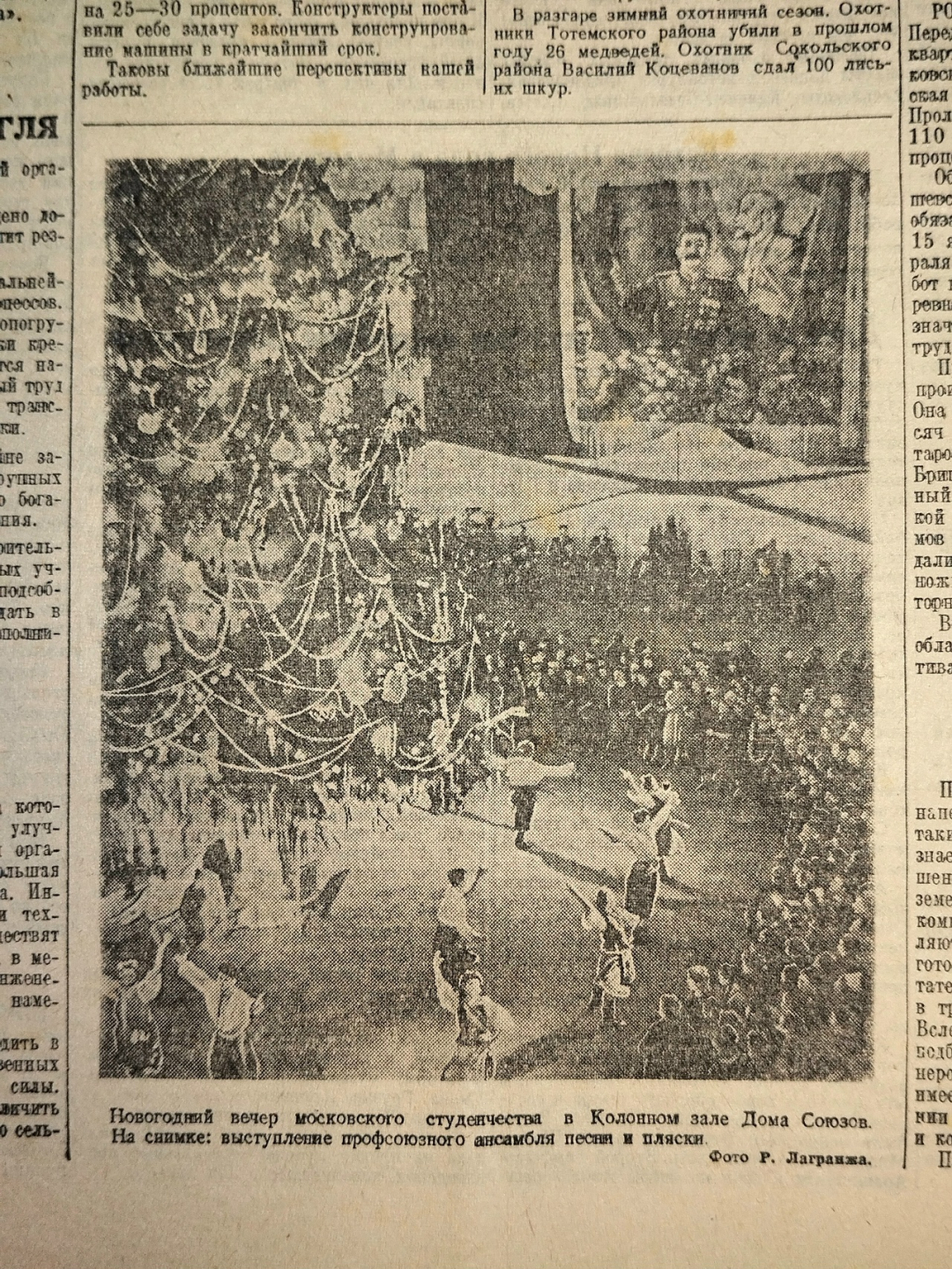 В первой под заголовком «Клубы готовятся к встрече нового года», рассказывается, как клуб завода имени Володарского воплощает в жизнь свою идею бала-маскарада. На торжество приглашено 500 человек, 300 из них будут в костюмах. Киоски с фруктовыми водами, множество сладостей в буфете, комната отдыха, читальня, на первом и втором этажах - концерты - все для гостей.