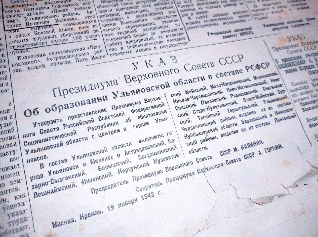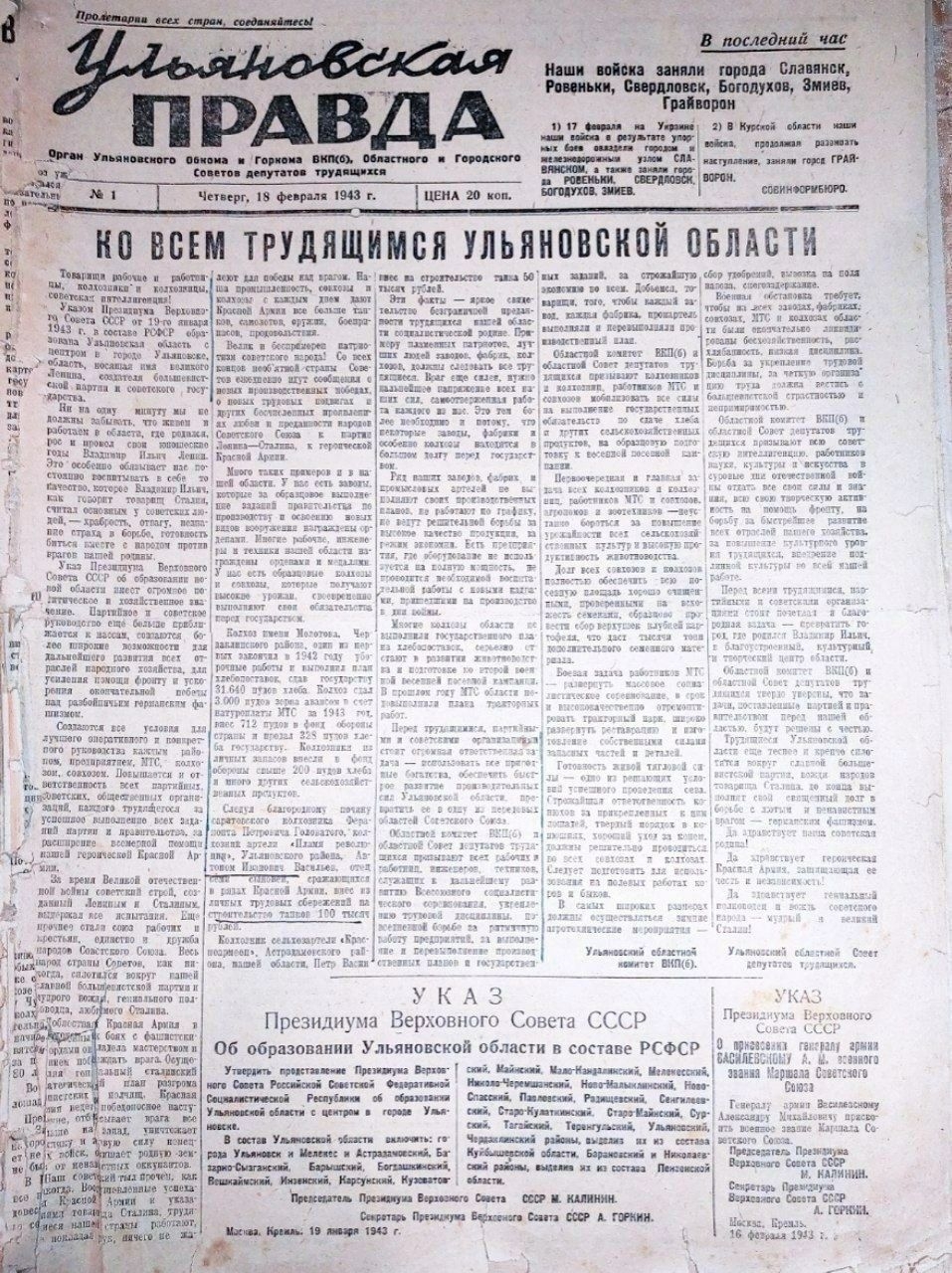 В январе 1943 года на карте появилась Ульяновская область, а в феврале этого же года вышел первый номер областной газеты «Ульяновская правда», в которой обнародован Указ об образовании Ульяновской области.