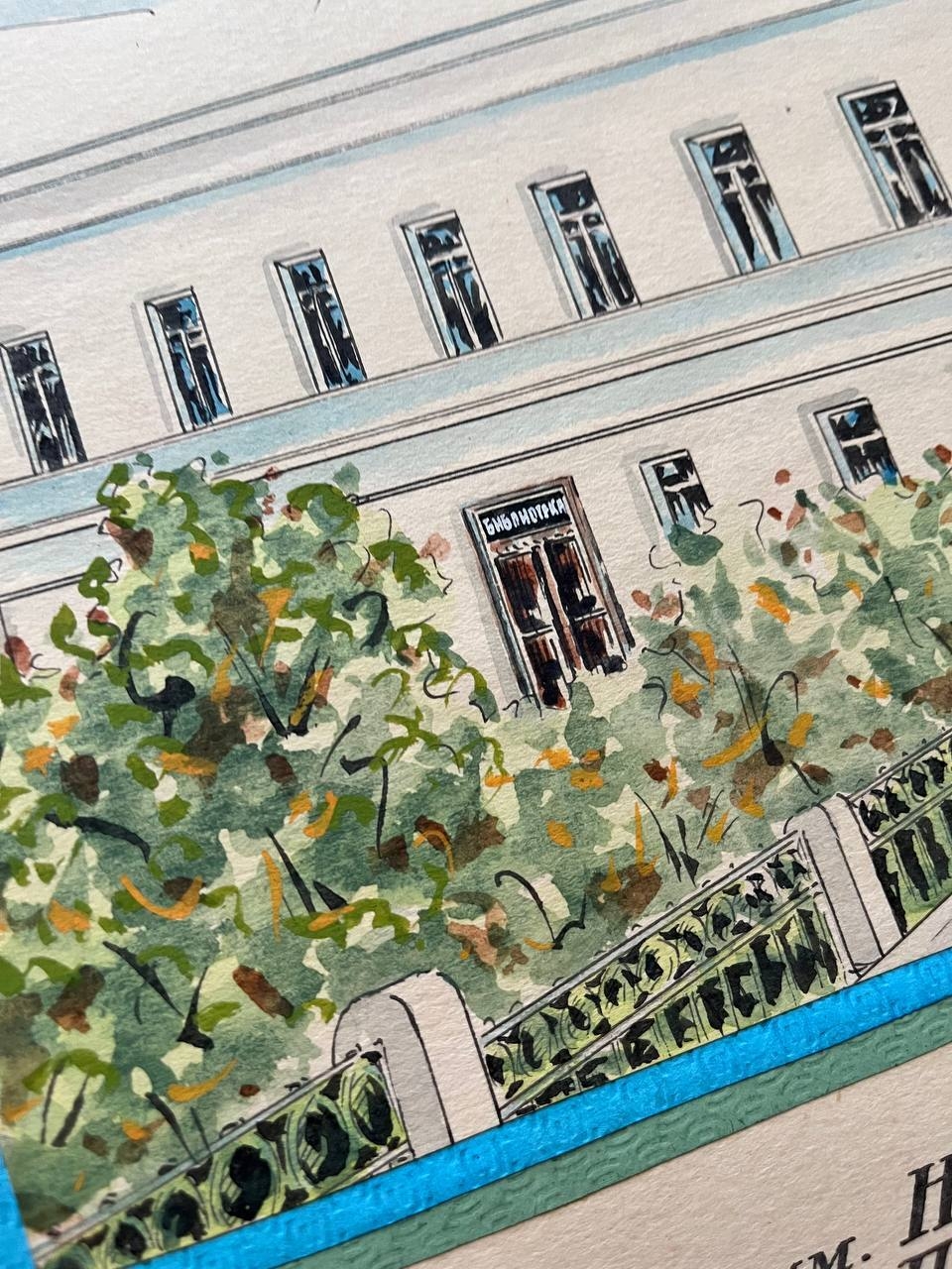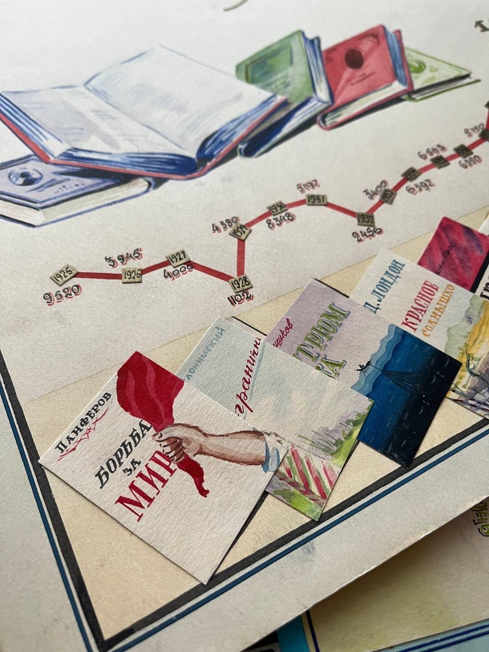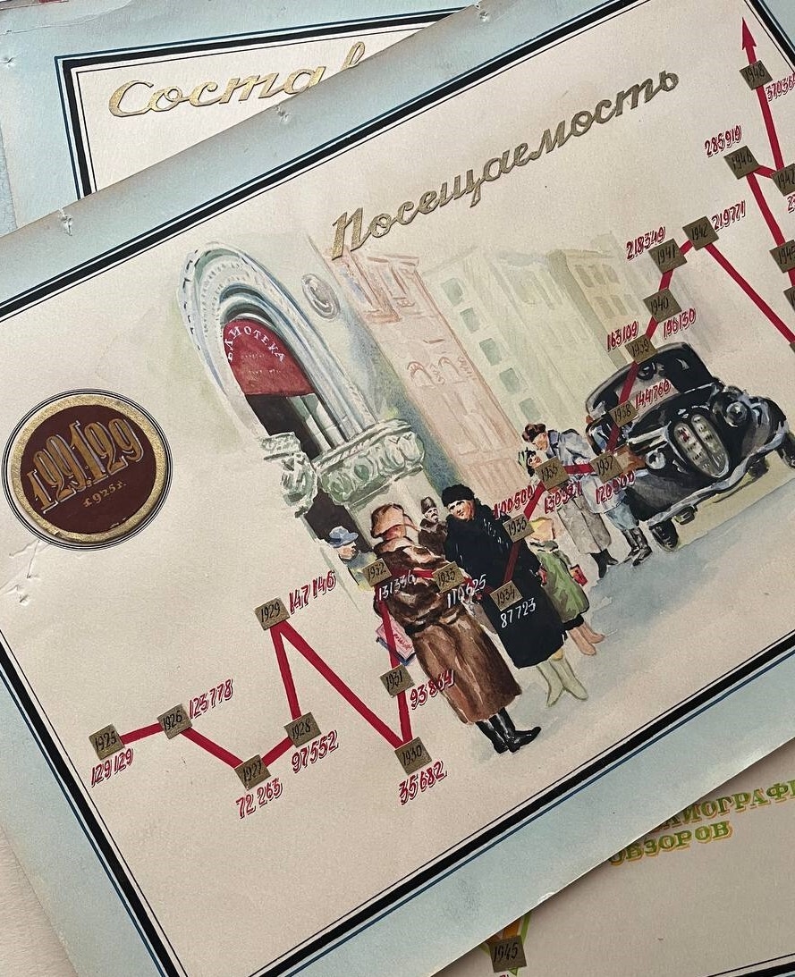 Больше данных о работе библиотеки в первой половине 20 века можно посмотреть на страницах альбома – привычная нам инфографика выполнена художником, сухие данные представлены через красочные иллюстрации, фотографии и узоры.