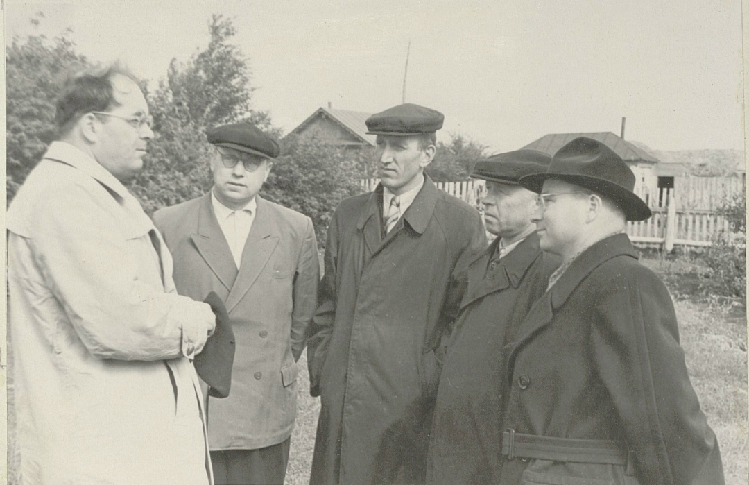 Профессор софийского университета Найден Чакыров (Болгария) беседует с руководящими работниками колхоза им. Свердлова в с. Новый Урень Ульяновского района. В Ульяновске он выступал с лекциями.
