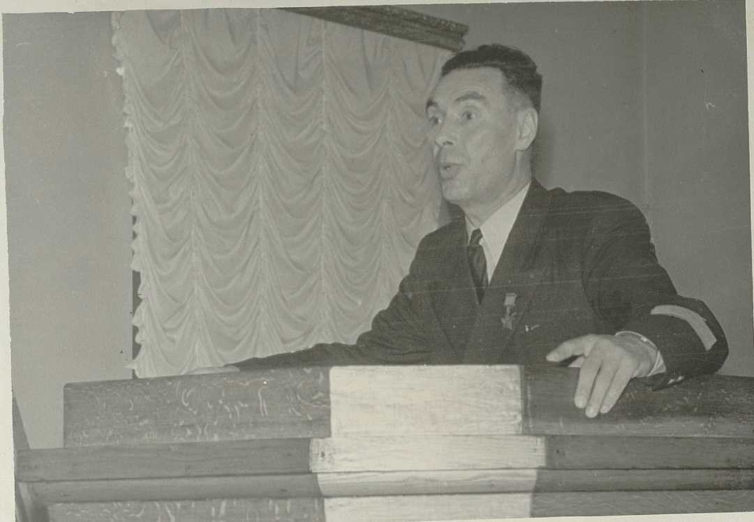 Диктор Всесоюзного радио Юрий Левитан выступает с публичной лекцией «У микрофона Москвы» в клубе Автозавода.