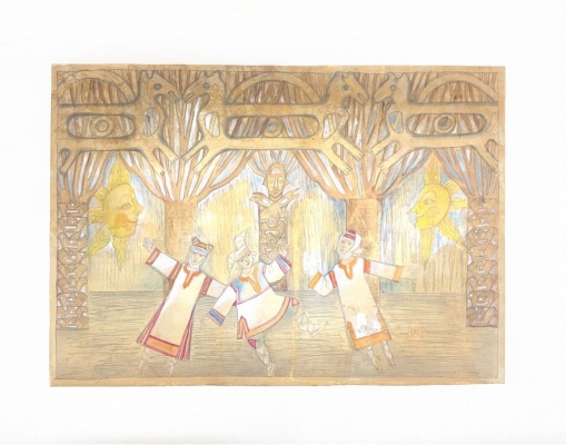 — Среди предметов, связанных с изображением масленичных традиций, выделяются эскизы декораций к балету А.Н. Островского «Снегурочка» на музыку П.И. Чайковского. В постановке есть сцена, которая называется «Проводы Масленицы». Премьера балета прошла в 2007 году в Государственном академическом театре Н.И. Сац. Эти эскизы принадлежат кисти известной художницы Ксении Шимановской. Ксения Володаровна много работала и работает с театрами, она — Заслуженный художник России. Эскизы выполнены на бумаге, для создания художница использовала белила, акварель и цветные карандаши. Любопытно, что эти эскизы еще не выставлялись для широкой аудитории. Выставочный дебют у них впереди, — рассказывает заведующая сектором учета и хранения Фондов Музея-заповедника «Родина В.И. Ленина» Елена Пайсина.