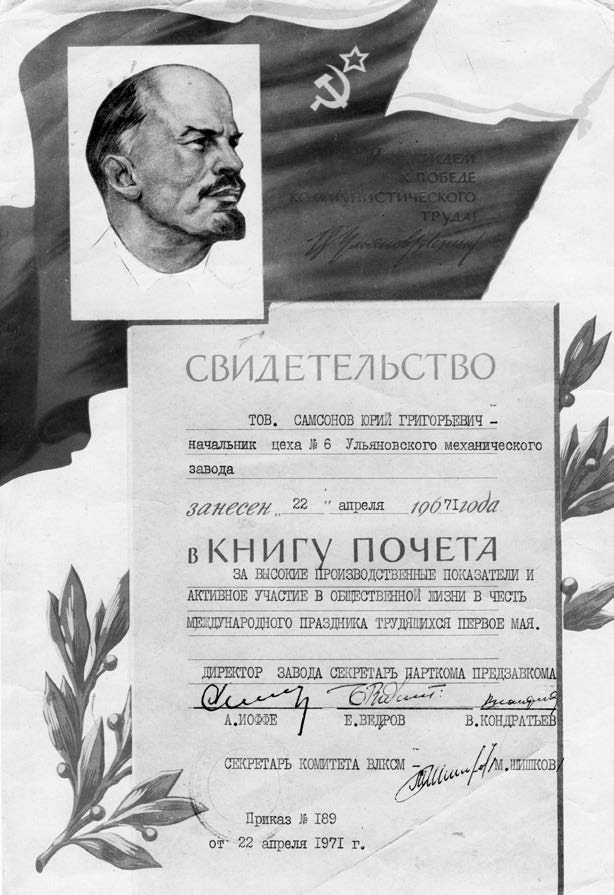 Свидетельство о занесении тов.Самсонова Ю. Г. – начальника цеха № 6 в Книгу Почета Ульяновскогомеханического завода, 1971 год: