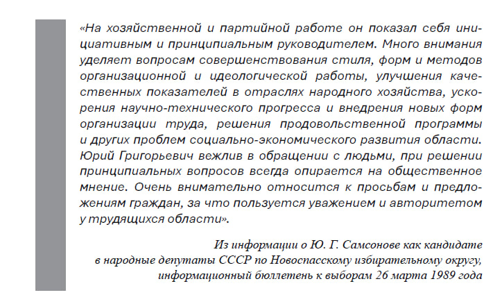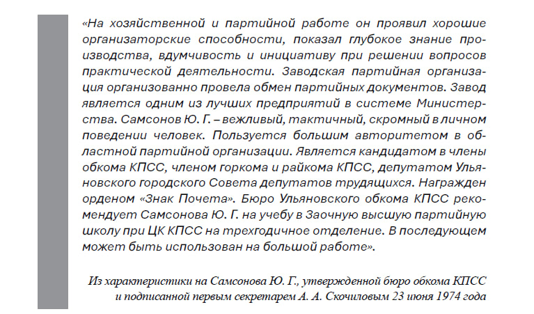 В апреле 1972 года Юрий Самсонов оставляет руководство цехом в связи с избранием секретарем парткома. Бюро Засвияжского райкома КПСС рассматривает его характеристику. В тексте отмечается, что на производстве он проявил себя как способный инженер и умелый организатор. В короткий срок улучшил дела в цехе, вывел его в число передовых. Значительно укрепил производственный и трудовой порядок. Поднял роль мастеров и повысил их ответственность за порученное дело. Принимает самое активное участие в партийной работе. Систематически работает над повышением своих знаний. Бумаги с характеристикой поднимаются в обком и горком КПСС. Выходят постановления об утверждении товарища Самсонова в должности секретаря парткома механического завода.