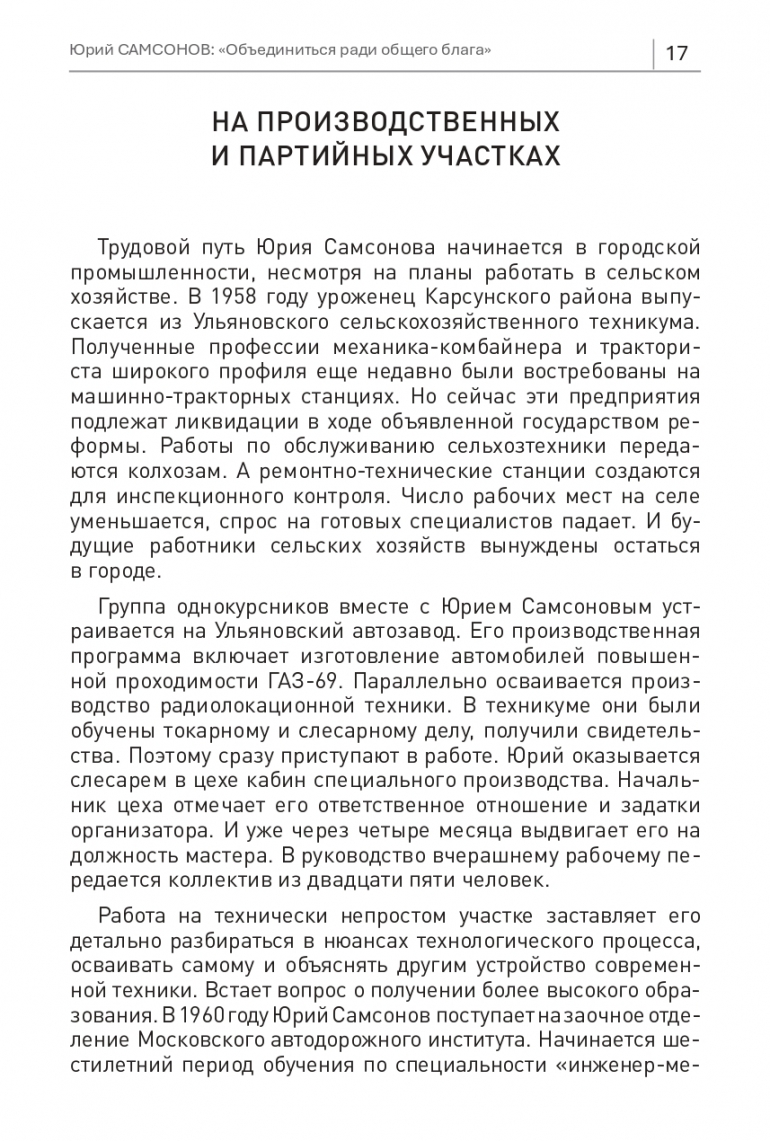 Трудовой путь Юрия Самсонова начинается в городской промышленности, несмотря на планы работать в сельском хозяйстве. В 1958 году уроженец Карсунского района выпускается из Ульяновского сельскохозяйственного техникума. Полученные профессии механика-комбайнера и тракториста широкого профиля еще недавно были востребованы намашинно-тракторных станциях. Но сейчас эти предприятия подлежат ликвидации в ходе объявленной государством реформы. Работы по обслуживанию сельхозтехники передаются колхозам. А ремонтно-технические станции создаются для инспекционного контроля. Число рабочих мест на селе уменьшается, спрос на готовых специалистов падает. И будущие работники сельских хозяйств вынуждены остаться в городе.