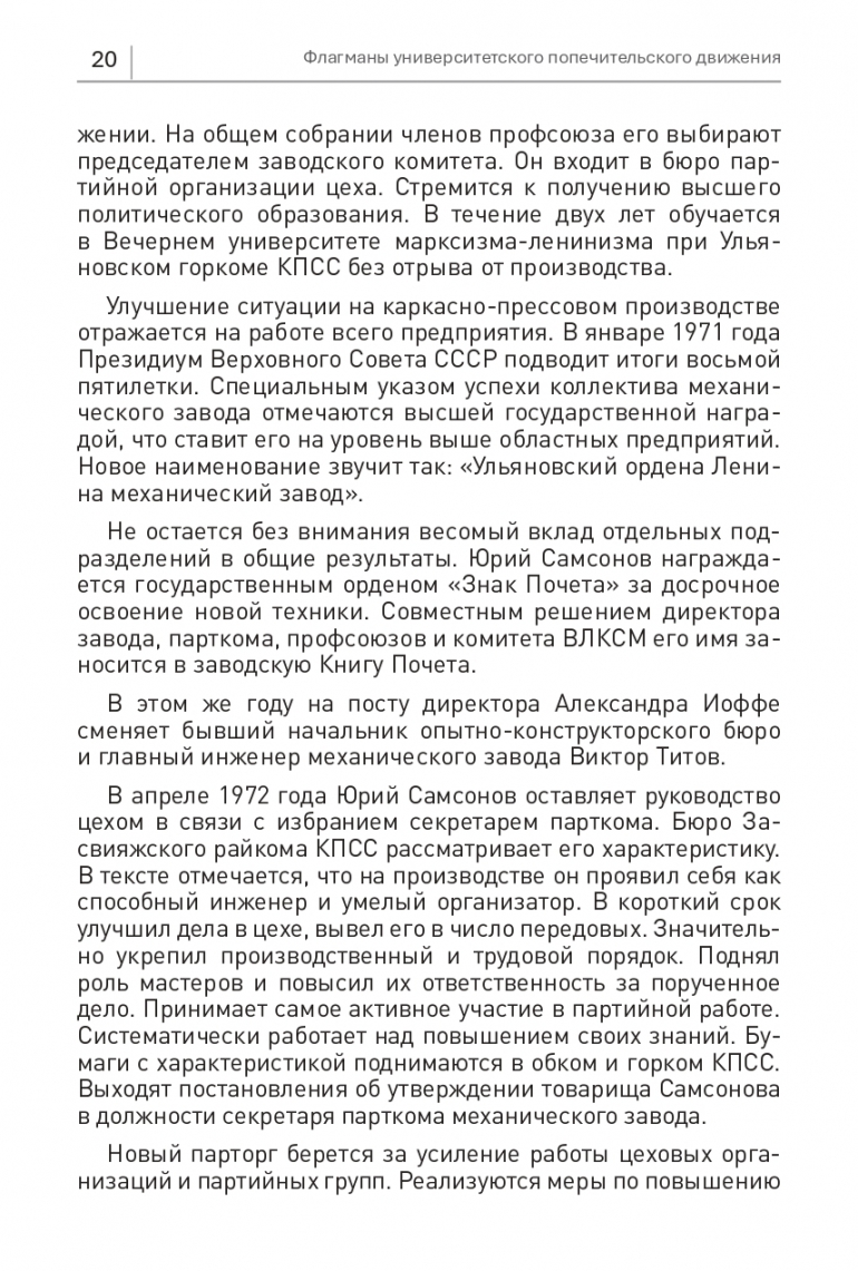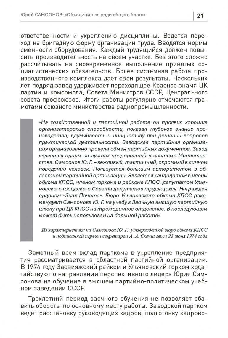 Заметный всем вклад парткома в укрепление предприятия рассматривается в областной партийной организации. В 1974 году Засвияжский райком и Ульяновский горком ходатайствуют о направлении перспективного лидера Юрия Самсонова на обучение в высшем партийно-политическом учебном заведении СССР.