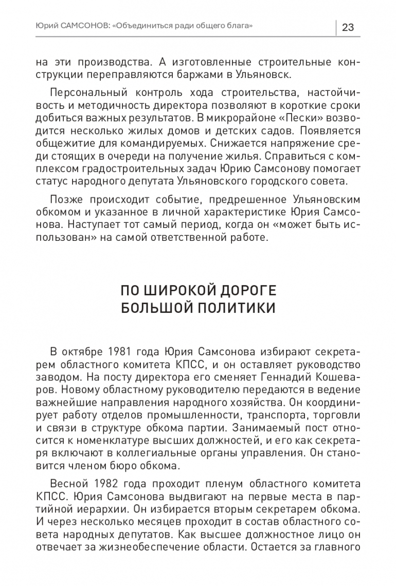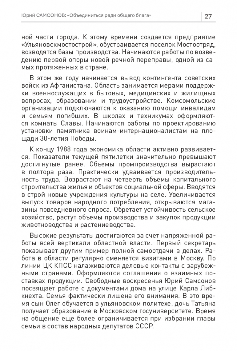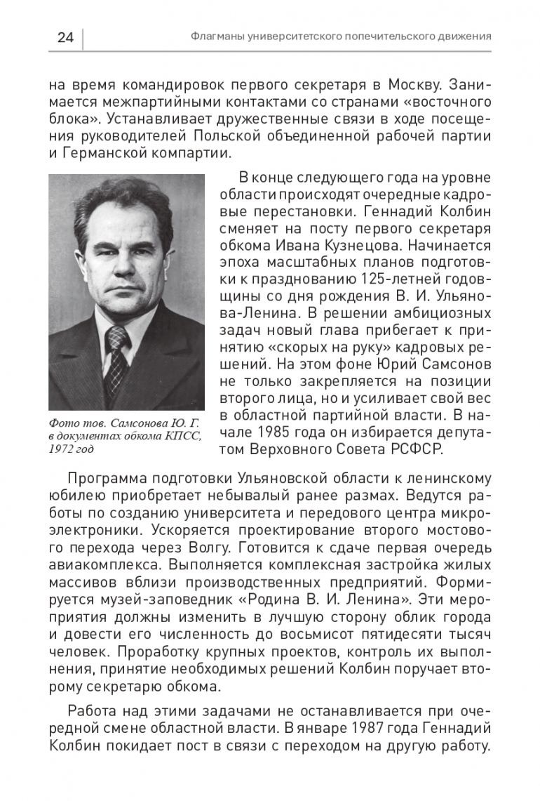 Под руководством товарища Колбина под областные программы подводится прочная идеологическая основа. Важно укрепить родину В. И. Ленина в качестве центра пропаганды идей ленинизма в преддверии знаменательной даты. Успешная реализация амбициозных планов опирается на слаженную работу первого и второго секретарей обкома. Геннадий Колбин имеет налаженные связи с первыми лицами государства, членами секретариата ЦК, министрами. Поэтому берется сам и привлекает своего заместителя к работе в высших эшелонах власти. Юрий Самсонов, в свою очередь, отвеча-ет за организацию работы хорошо знакомых ему властей на местном уровне. Он помогает им в понимании рабочих вопросов, более методичном и энергичном решении возникающих проблем.