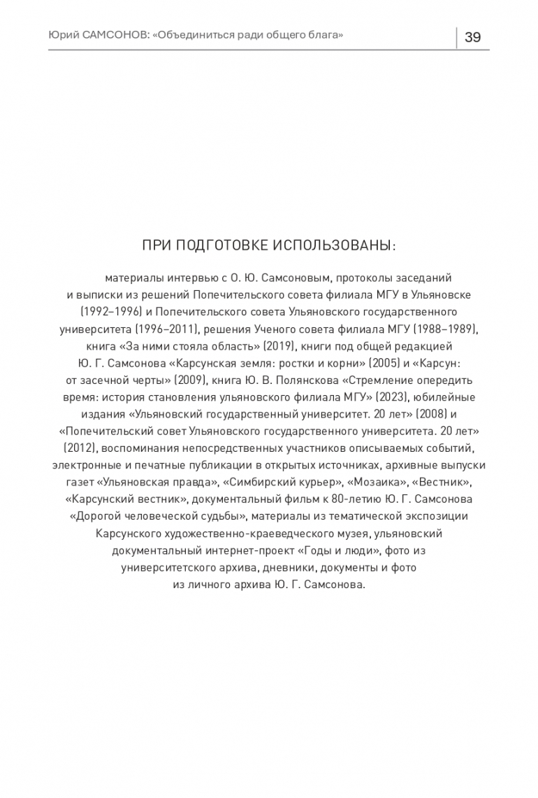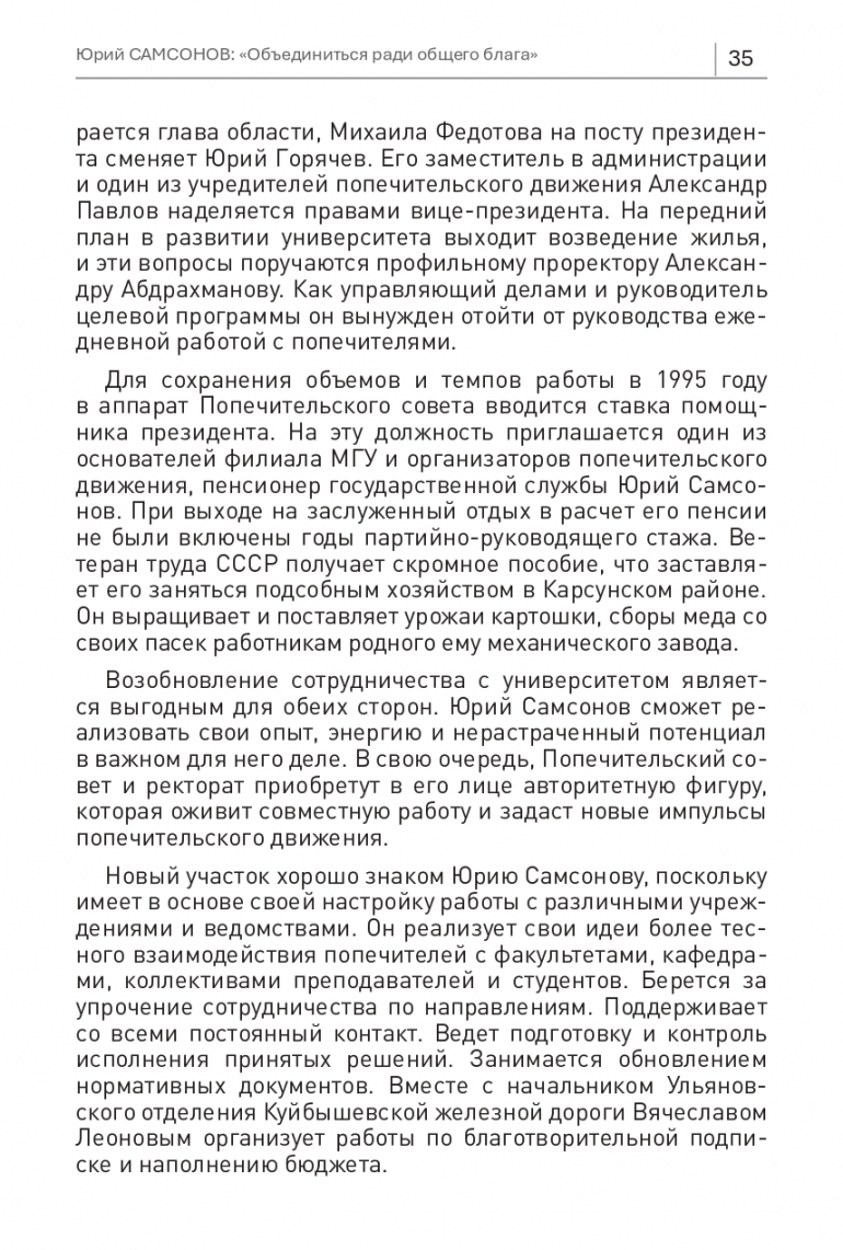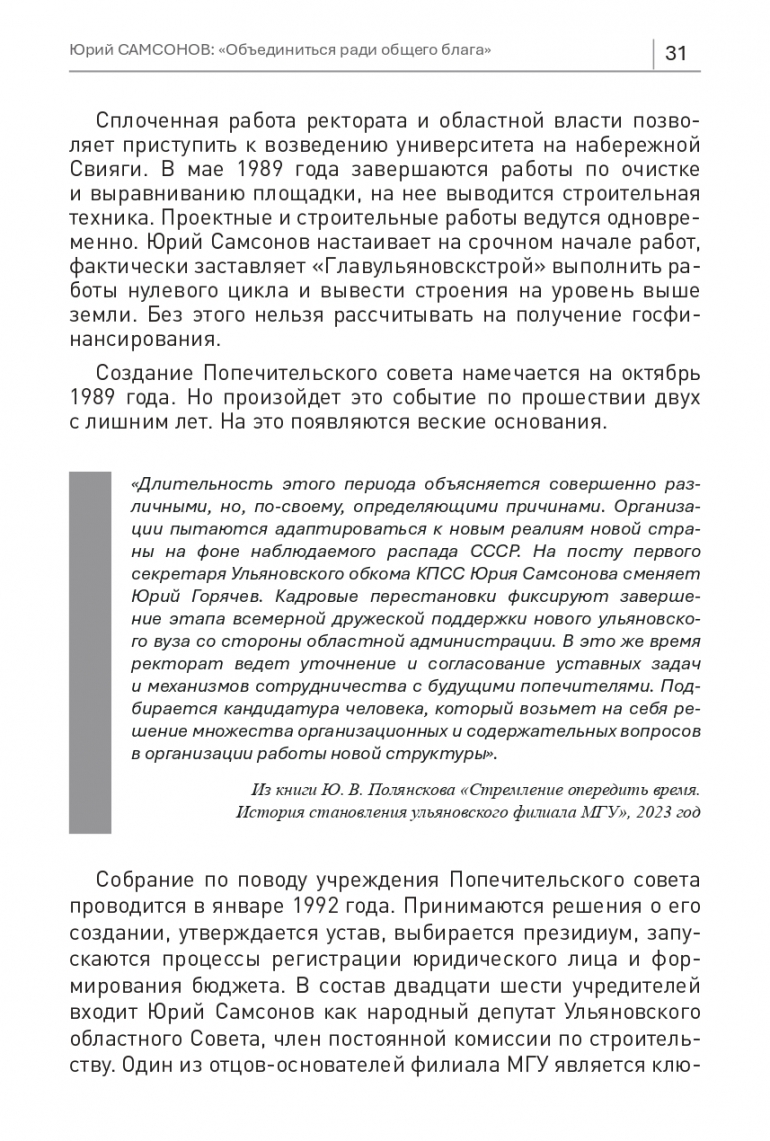 Собрание по поводу учреждения Попечительского советапроводится в январе 1992 года. Принимаются решения о его создании, утверждается устав, выбирается президиум, запускаются процессы регистрации юридического лица и формирования бюджета. В состав двадцати шести учредителей входит Юрий Самсонов как народный депутат Ульяновского областного Совета, член постоянной комиссии по строительству. Один из отцов-основателей филиала МГУ является ключевой фигурой в организации попечительского движения. Его мотивы связаны с переживаниями за судьбу нового российского образования на фоне повсеместного отказа от «пережитков» советского прошлого. Того самого времени, когда все были равны и работали на один котел, на одну задачу.