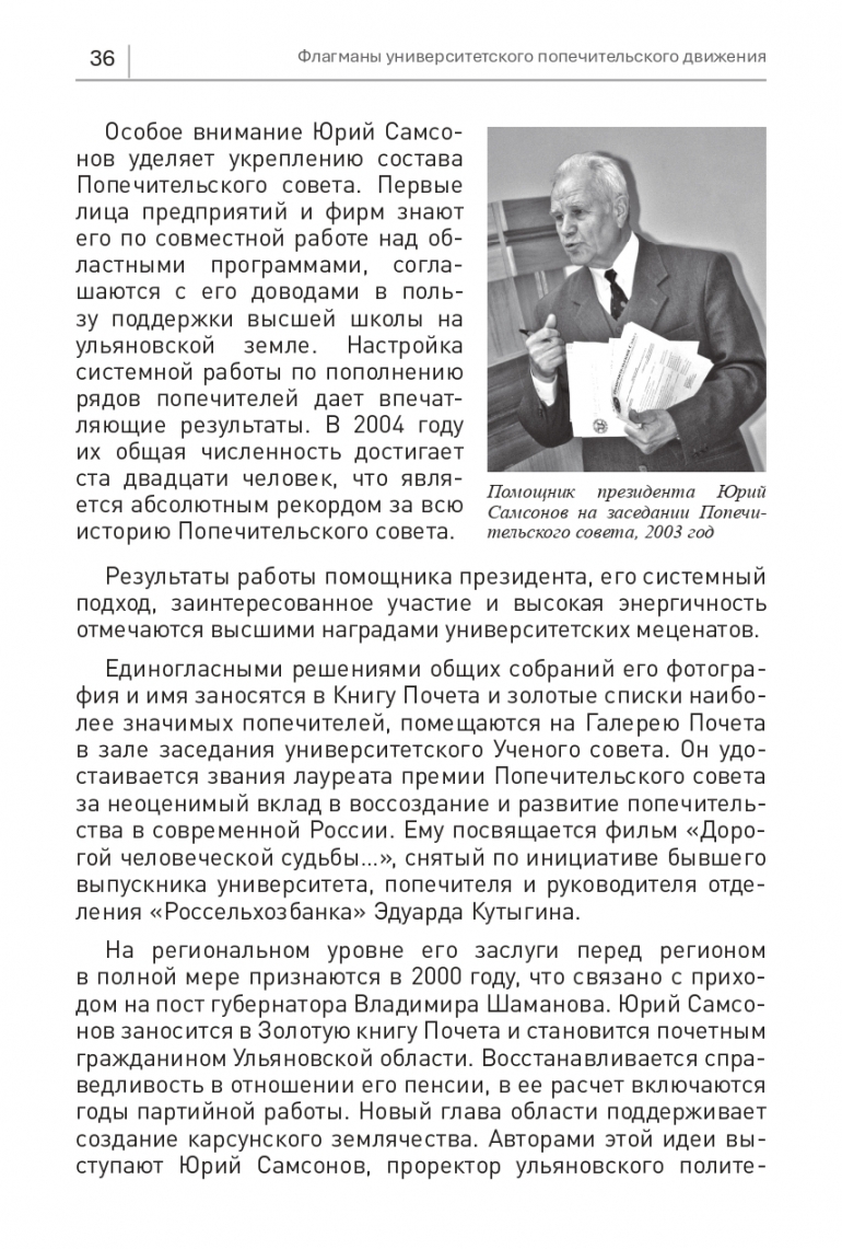 Особое внимание Юрий Самсонов уделяет укреплению состава Попечительского совета. Первые лица предприятий и фирм знаютего по совместной работе над областными программами, соглашаются с его доводами в пользу поддержки высшей школы наульяновской земле. Настройка системной работы по пополнению рядов попечителей дает впечатляющие результаты. В 2004 году их общая численность достигает ста двадцати человек, что является абсолютным рекордом за всю историю Попечительского совета.