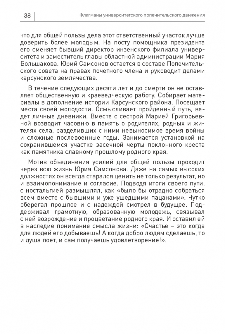 Мотив объединения усилий для общей пользы проходит через всю жизнь Юрия Самсонова. Даже на самых высоких должностях он всегда старался ценить не только результат, нои взаимопонимание и согласие. Подводя итоги своего пути,с ностальгией размышлял, как «было бы отрадно собраться всем вместе с бывшими и уже ушедшими пацанами». Чутко оберегал прошлое и с надеждой смотрел в будущее. Поддерживал грамотную, образованную молодежь, связывал с ней возрождение и процветание родного края. И оставил ей в наследие понимание смысла жизни: «Счастье – это когда для людей его добываешь! А когда добро людям сделаешь, то и душа поет, и сам получаешь удовлетворение!».