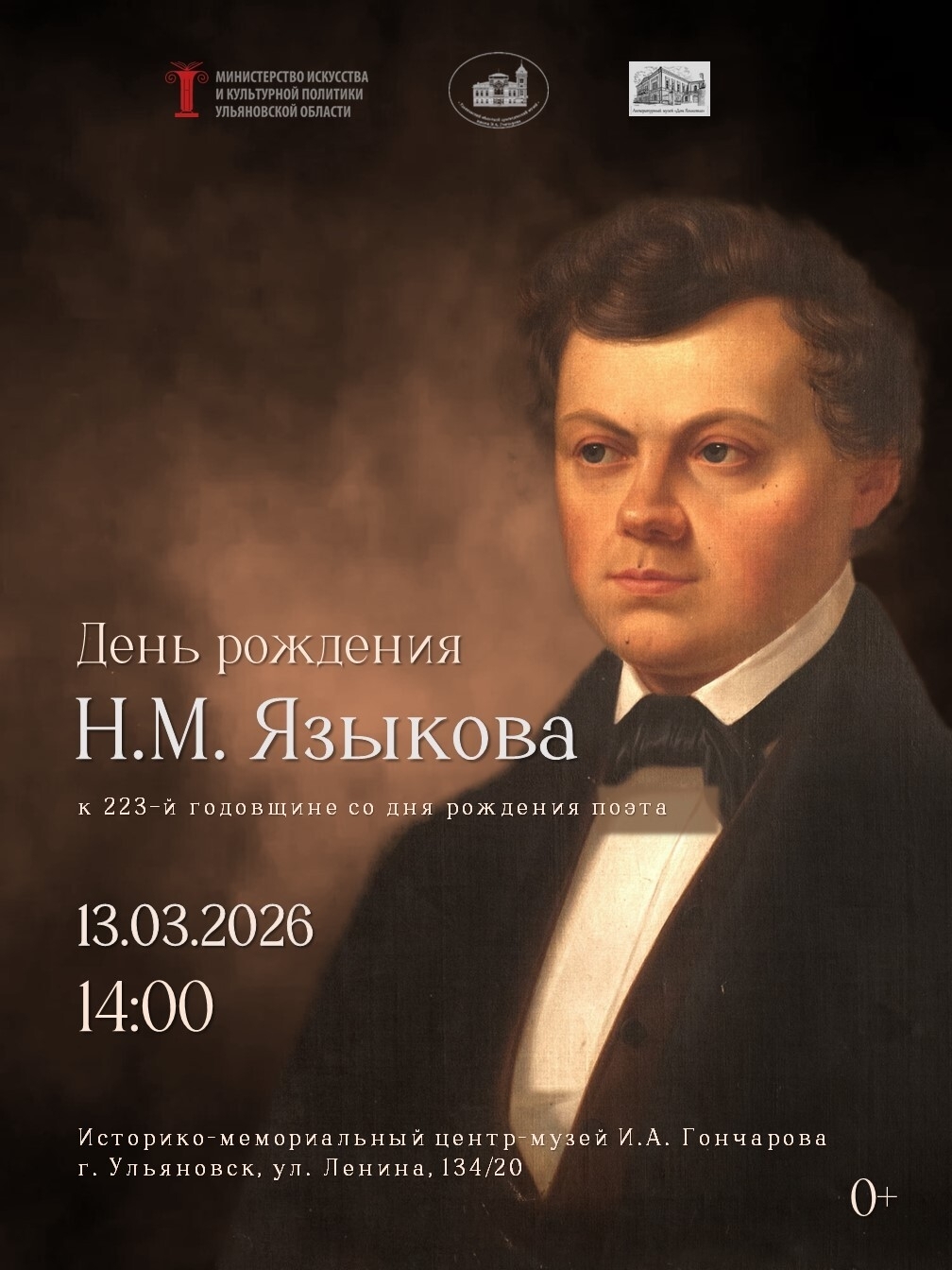13 марта в 14:00 в Историко-мемориальном центре-музее И.А. Гончарова состоится праздничное мероприятие, посвященное 223-й годовщине со дня рождения поэта-симбирянина Н.М. Языкова (1803-1846), чье творчество по праву занимает место в золотом фонде русской лирики XIX века.