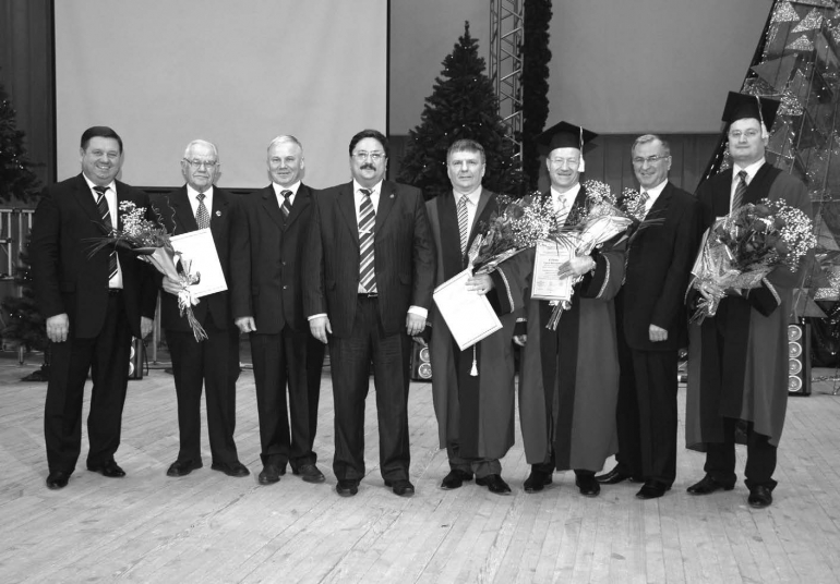 Чествование выдающихся попечителей за весомую поддержку вуза. Мантиии дипломы о размещении на Галерее Почета вручены А. Полякову, С. Куркову, Э. Кутыгину. Рядом первые лица Попечительского совета и университета А. Шмелев,Ю. Самсонов, В. Марусин, Б. Костишко, Ю. Полянсков. 2008 год: