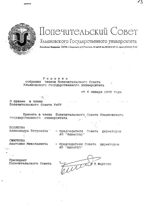 На торжественном собрании в январе 1998 года выносится вопрос о приеме в Попечительский совет двух видных руководителей. Это председатель совета директоров авиа комплекса Александр Поляков и председатель совета директоров автозавода Анатолий Смирнов. Новые попечители университета работают с областной властью в тесном контакте. Решение каждого из них является тщательно обдуманным и выверенным. И они готовы привести весомые аргументы в ответ на возможные вопросы или претензии областной администрации.