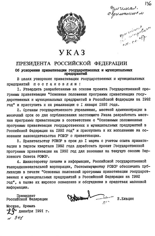 Указ Президента РФ о приватизации госпредприятий, 1991 год: