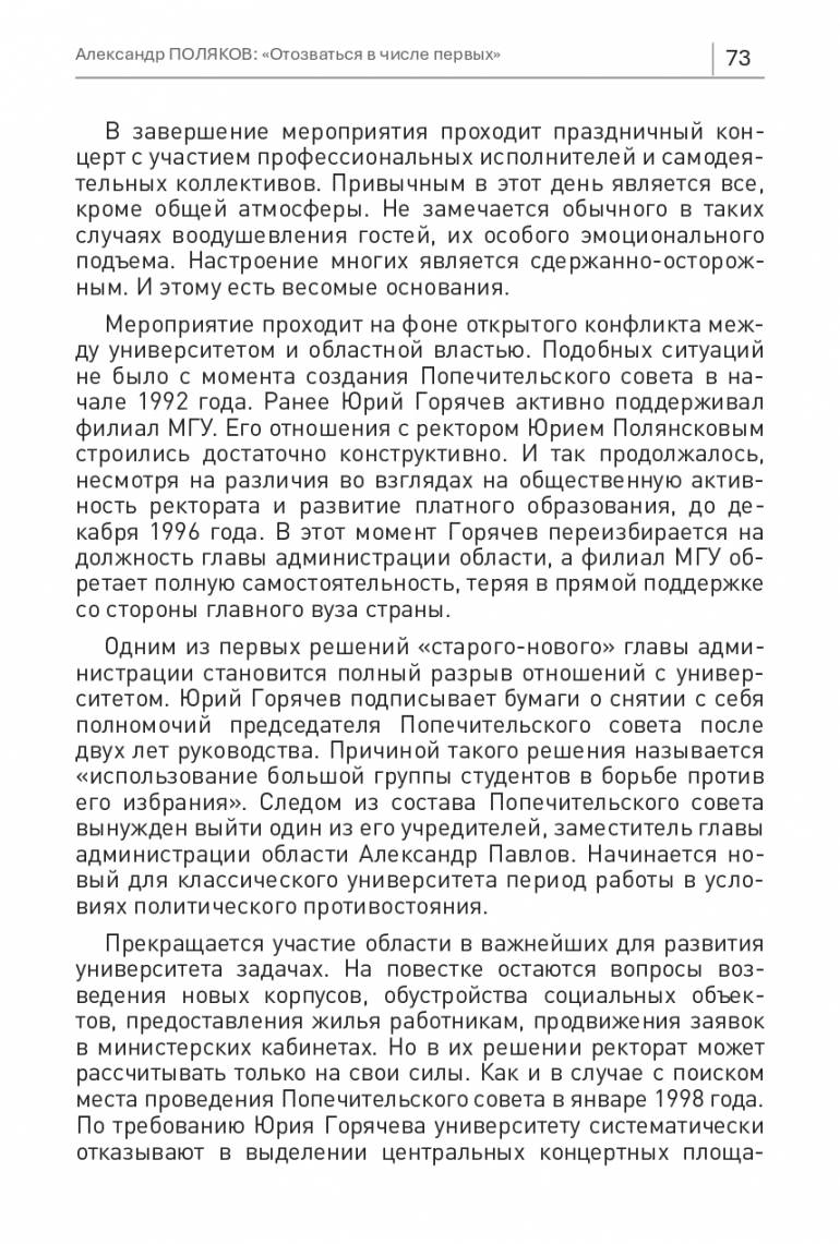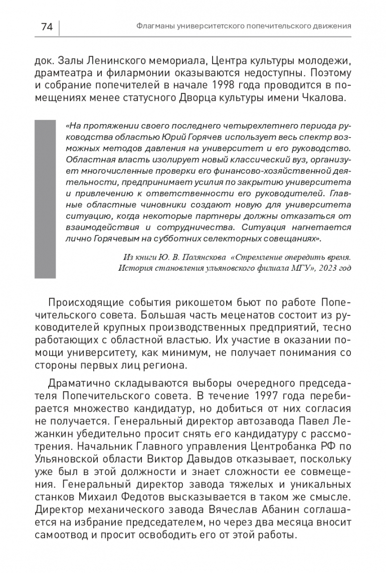 «На протяжении своего последнего четырехлетнего периода руководства областью Юрий Горячев использует весь спектр возможных методов давления на университет и его руководство. Областная власть изолирует новый классический вуз, организует многочисленные проверки его финансово-хозяйственной деятельности, предпринимает усилия по закрытию университета и привлечению к ответственности его руководителей. Главные областные чиновники создают новую для университета ситуацию, когда некоторые партнеры должны отказаться от взаимодействия и сотрудничества. Ситуация нагнетается лично Горячевым на субботних селекторных совещаниях». Из книги Ю.В. Полянскова «Стремление опередить время. История становления ульяновского филиала МГУ», 2023 год