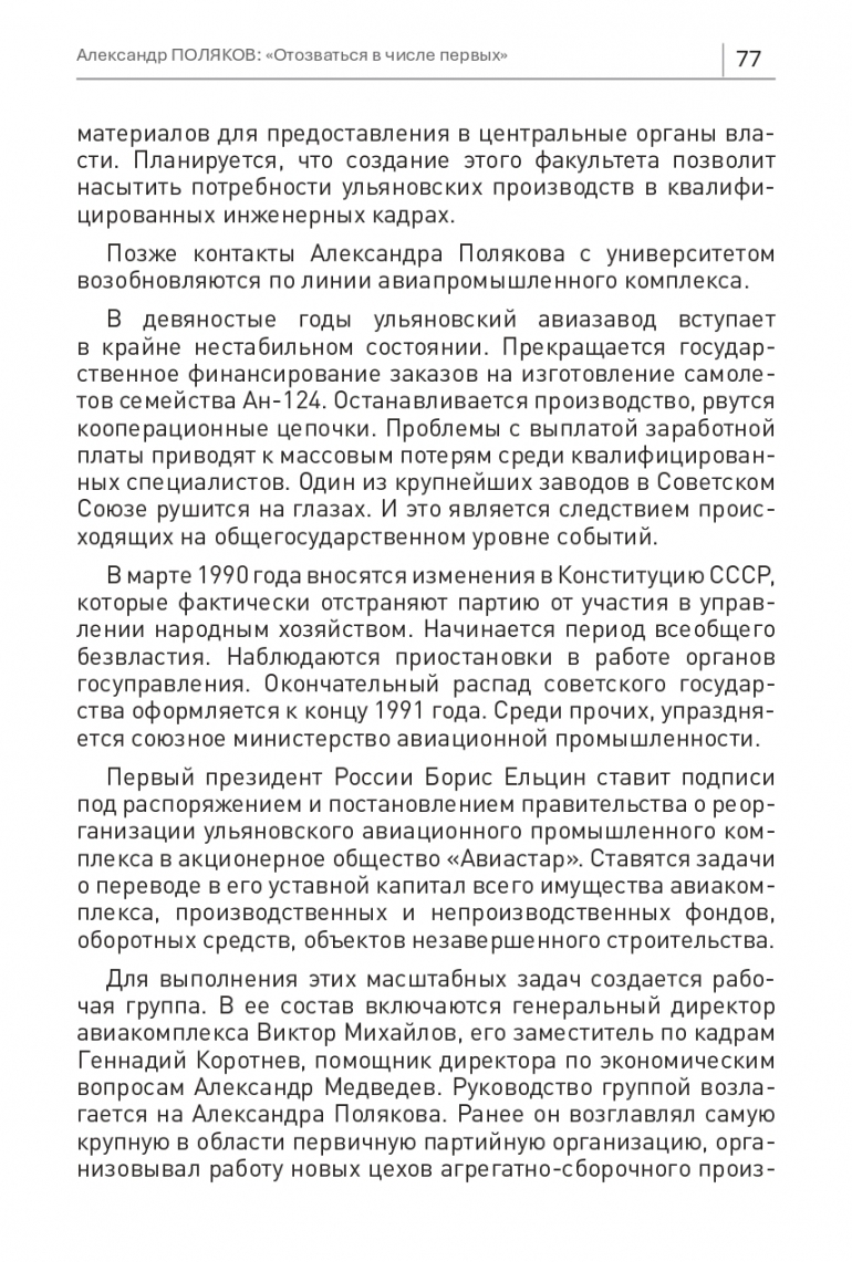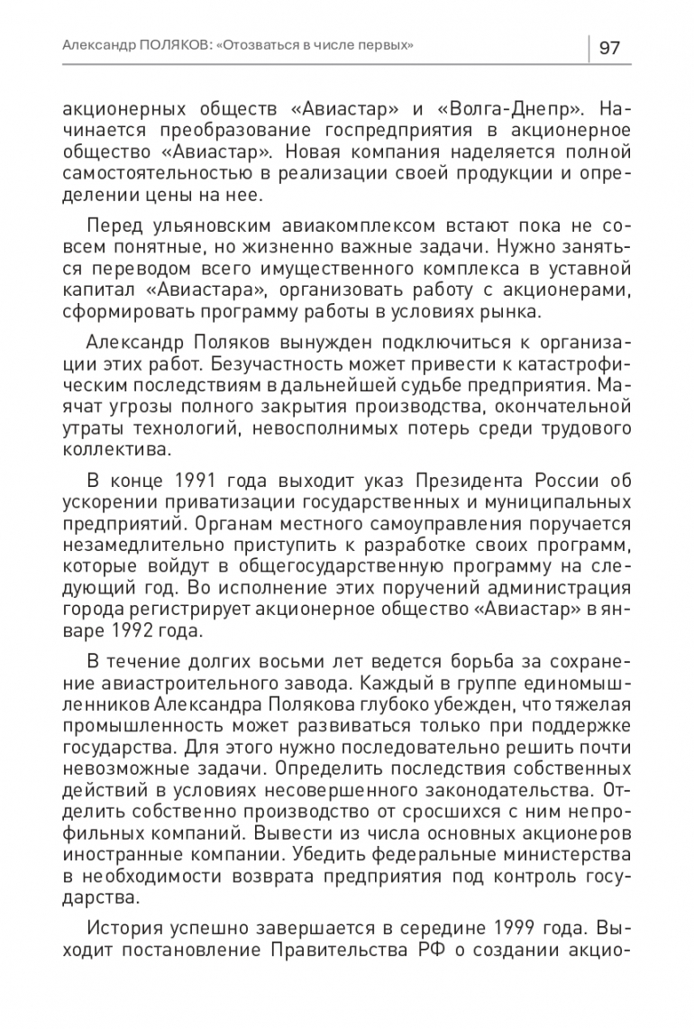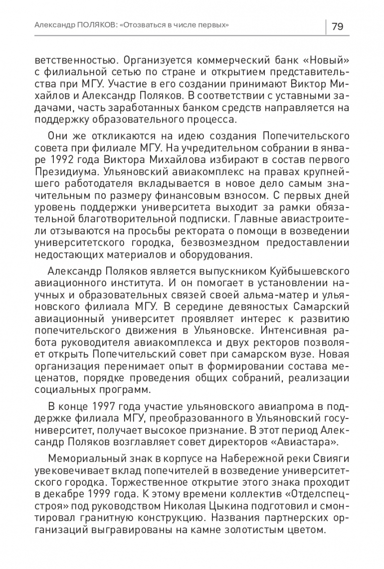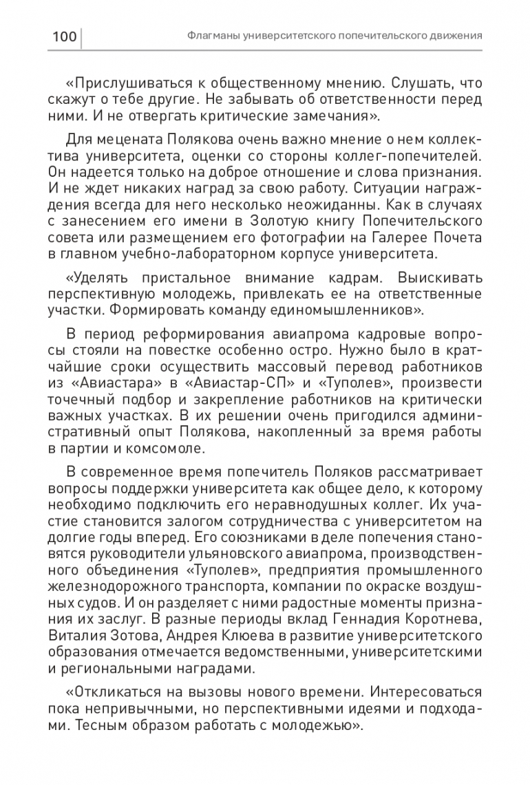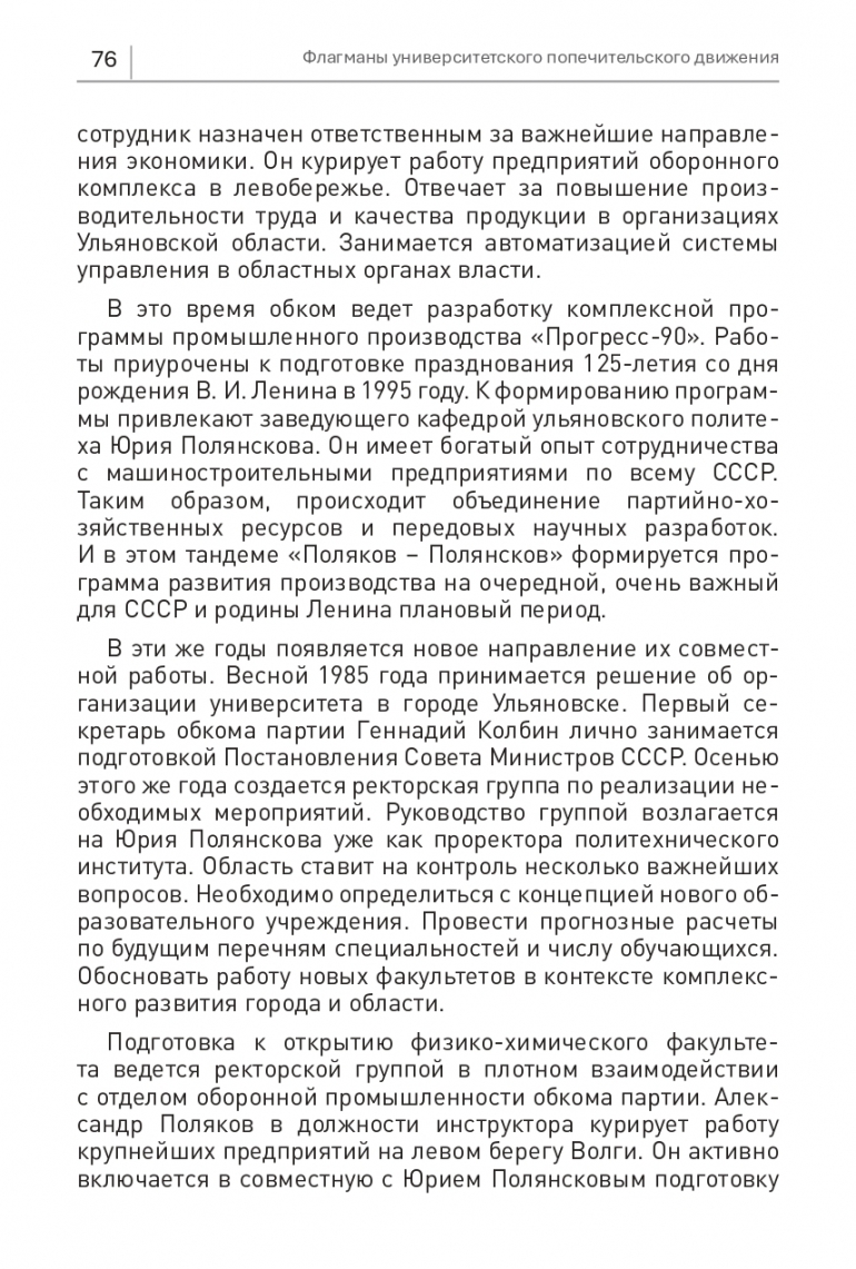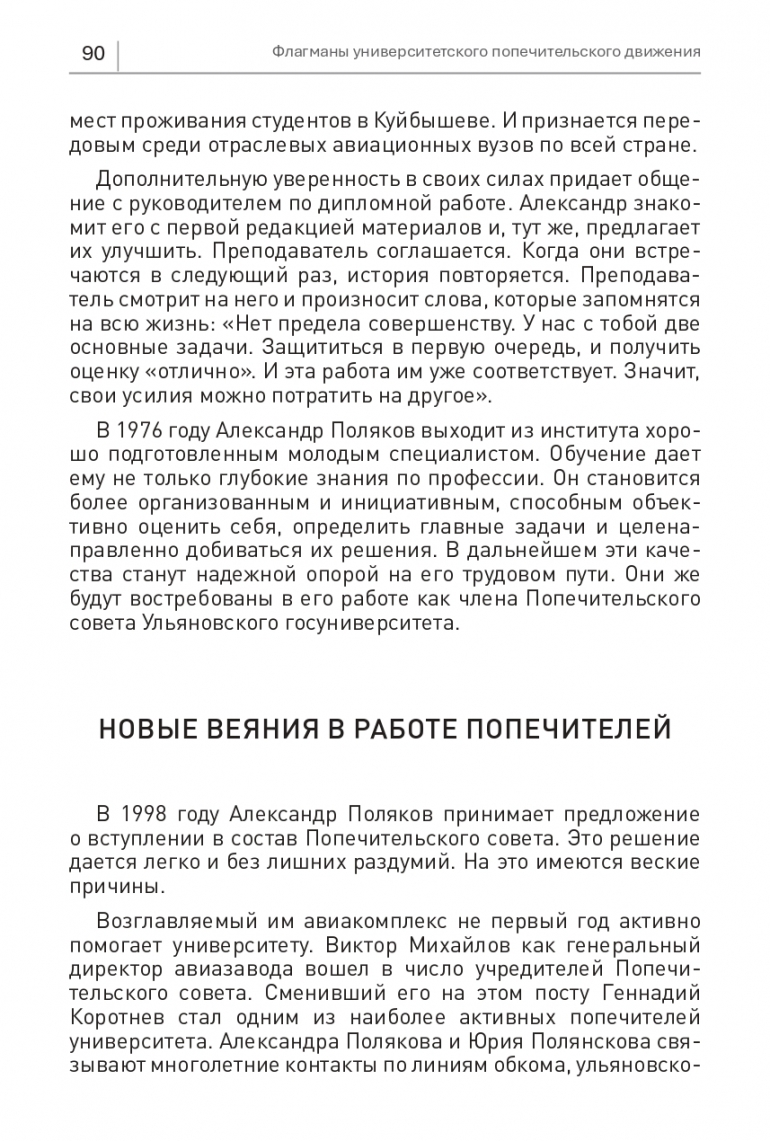 УлГУ презентовал книгу «Флагманы университетского попечительского движения». Ее автор первый ректор, а ныне президент вуза Юрий Полянсков. Издание вышло ограниченным тиражом и, чтобы как можно больше людей могли прочитать книгу, эксклюзивно на 73online.ru будут опубликованы все главы первого тома. Сегодняшняя посвящена экс-председателю совета директоров ЗАО «Авиастар-СП» Александру Полякову.