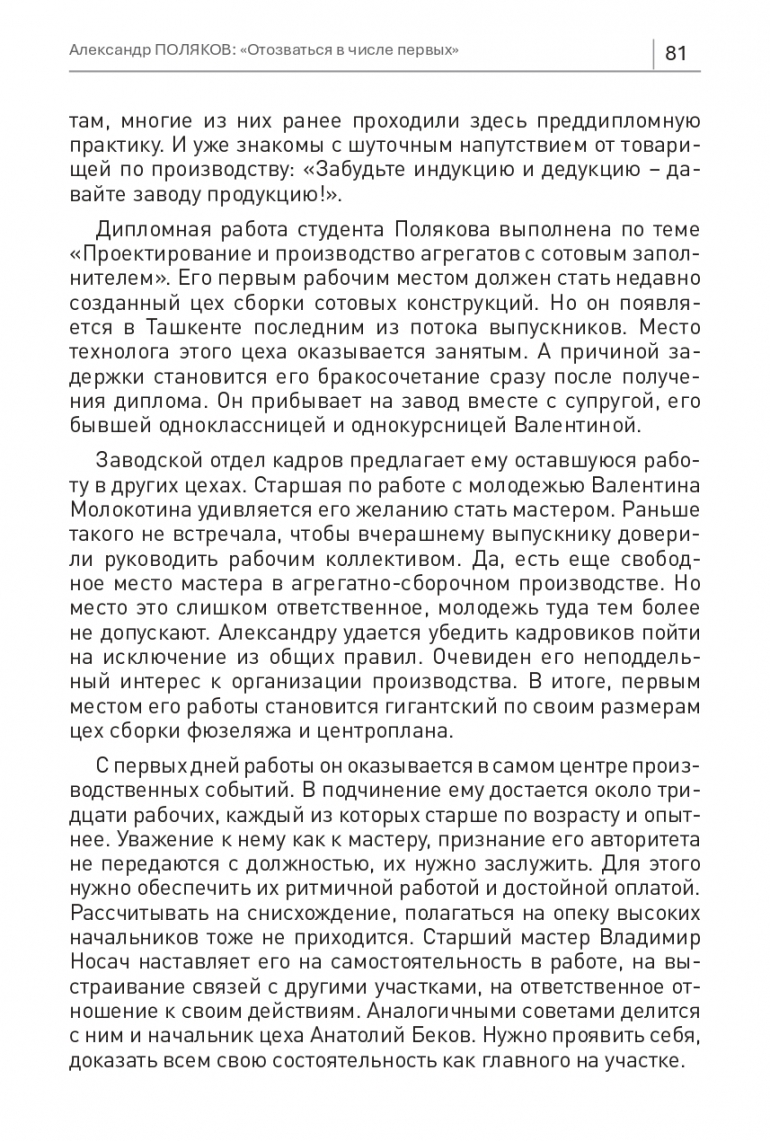 Долгие годы Александр Поляков твердо удерживает руку на пульсе событий. Ему интересен анализ жизни общества, производства и образования. Он размышляет над взаимосвязями происходящих здесь и там процессов. Он активно подключается к решению новых, перспективных задач. Чутко реагировать на запросы нового времени помогают и внутренняя потребность, и товарищеская поддержка единомышленников, и энергичное участие супруги Елены. А все вместе это позволяет удерживать лидерство в отклике на большие и сложные дела, из которых и складывается наше будущее.