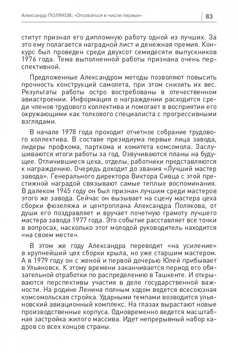 В начале 1978 года проходит отчетное собрание трудового коллектива. В составе президиума первые лица завода, лидеры профкома, парткома и комитета комсомола. Заслушиваются итоги работы за год. Озвучиваются планы на будущее. Отличившиеся цеха, отделы, работники представляются к награждению. Очередь доходит до звания «Лучший мастерзавода». Генерального директора Виктора Сивца с этой престижной наградой связывают самые теплые воспоминания. В далеком 1945 году он был признан лучшим среди мастеров этого же завода. Сейчас он вызывает на сцену мастера цеха сборки фюзеляжа и центроплана Александра Полякова, от души его поздравляет и вручает почетную грамоту лучшего мастера завода 1977 года. Это событие расставляет все точки в вопросах, насколько этот молодой руководитель находится «на своем месте».