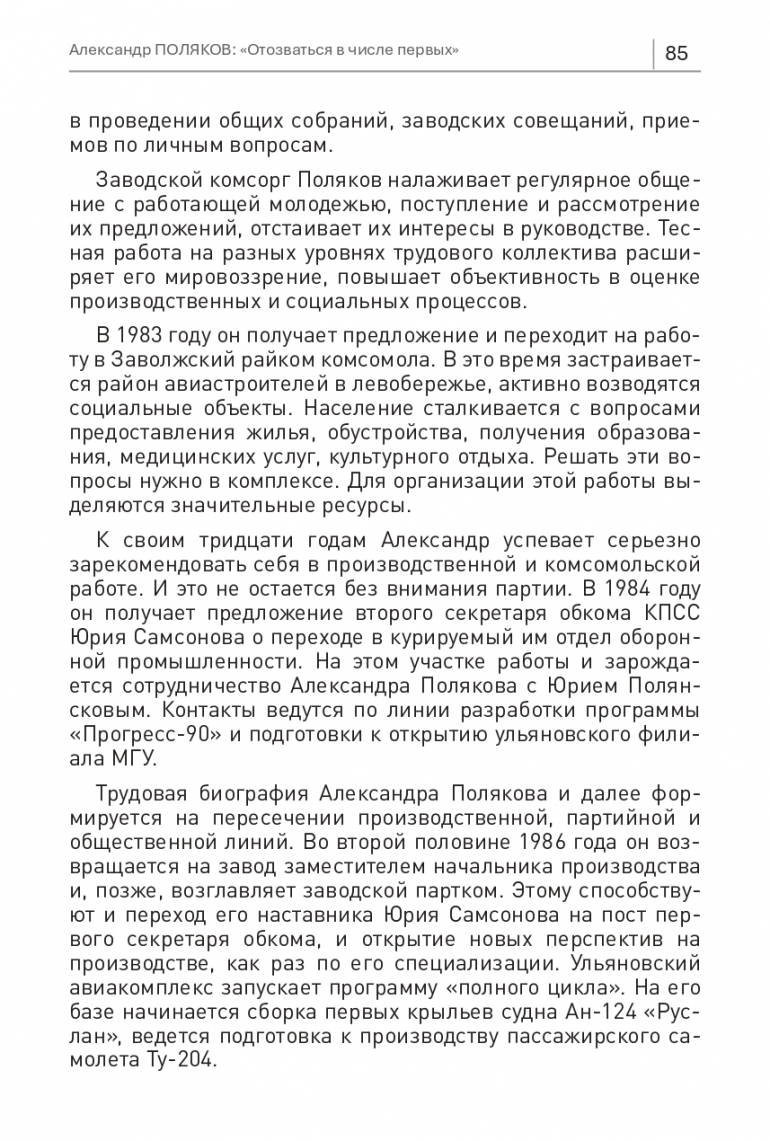 Александр Поляков принимает предложение и устраивается мастером в цех агрегатно-сборочного производства. Интерес ульяновского предприятия к его кандидатуре понятен и объясним. За время работы на крупнейшем в СССР авиазаводе в Ташкенте он утвердился способным организатором производства. Многие технологические процессы ему хорошо знакомы. Переданный ему план производства включает подготовку комплектов для сборки тяжелого транспортного самолета Ан-124 «Руслан».