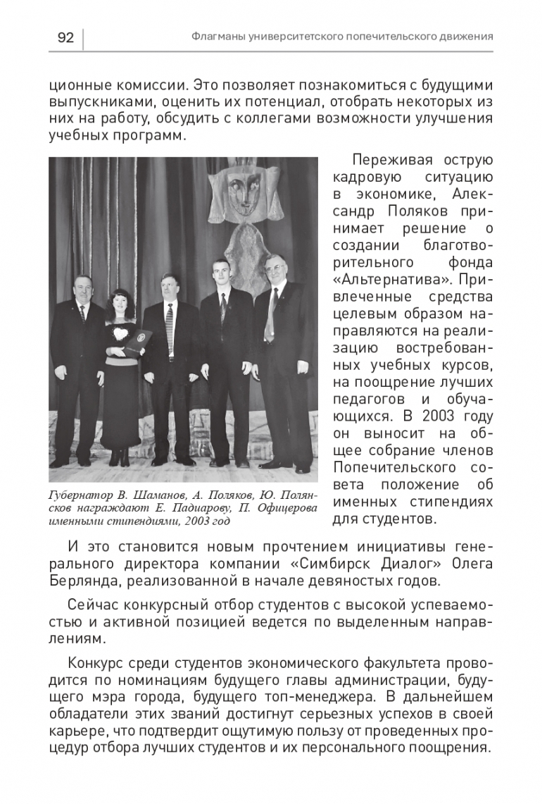 Переживая острую кадровую ситуациюв экономике, Александр Поляков принимает решение осоздании благотворительного фонда «Альтернатива». Привлеченные средства целевым образом направляются на реализацию востребованных учебных курсов, на поощрение лучших педагогов и обучающихся. В 2003 году он выносит на общее собрание членов Попечительского совета положение обименных стипендиях для студентов.