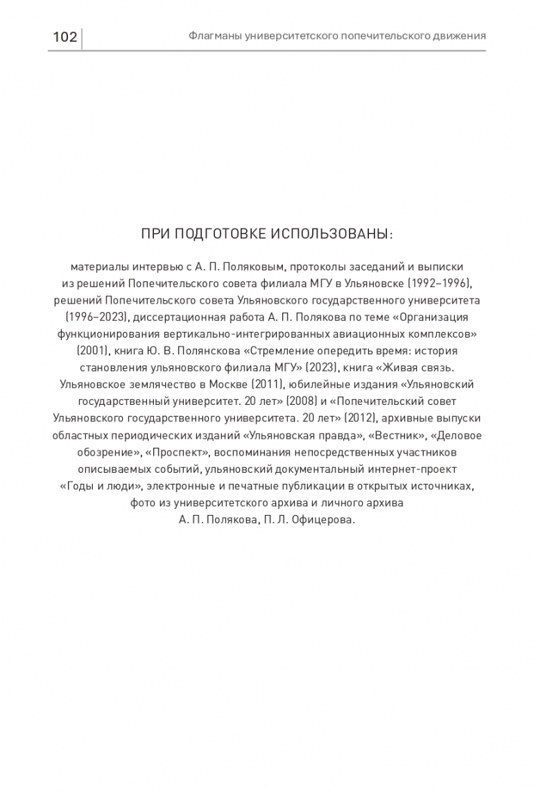 ПРИ ПОДГОТОВКЕ ИСПОЛЬЗОВАНЫ: материалы интервью с А. П. Поляковым, протоколы заседаний и выписки из решений Попечительского совета филиала МГУ в Ульяновске (1992−1996), решений Попечительского совета Ульяновского государственного университета (1996−2023), диссертационная работа А. П. Полякова по теме «Организация функционирования вертикально-интегрированных авиационных комплексов» (2001), книга Ю. В. Полянскова «Стремление опередить время: история становления ульяновского филиала МГУ» (2023), книга «Живая связь. Ульяновское землячество в Москве (2011), юбилейные издания «Ульяновский государственный университет. 20 лет» (2008) и «Попечительский совет Ульяновского государственного университета. 20 лет» (2012), архивные выпуски областных периодических изданий «Ульяновская правда», «Вестник», «Деловоеобозрение», «Проспект», воспоминания непосредственных участников описываемых событий, ульяновский документальный интернет-проект«Годы и люди», электронные и печатные публикации в открытых источниках,фото из университетского архива и личного архива А. П. Полякова, П. Л. Офицерова.