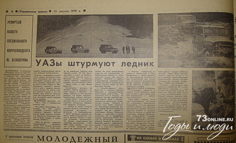 - Одной из задач, которые решали сегодня ульяновцы – испытатели автомашин, - рассказал А. Берберашвили, - была проверка ходовых качеств, работоспособность узлов и деталей УАЗов в тяжелых условиях высокогорья. На ледник поднимались три серийные автомашины УАЗ-469Б. Надо сказать, что все они отлично выдержали экзамен на трудность, на перегрузки. Ни одно транспортное средство не поднималось на Эльбрусский ледник за такое короткое время, как машины волжан. УАЗ-469Б – первый отечественный серийный автомобиль, которому оказался «по плечу» подъем сюда, на Эльбрусский ледник (...)