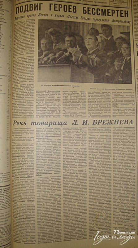 Радостные, волнующие дни переживает город-герой Новороссийск, вся Кубань. Здесь на берегу Цемесской бухты проходит торжества, посвященные вручению городу ордена Ленина и медали «Золотая звезда» (...)