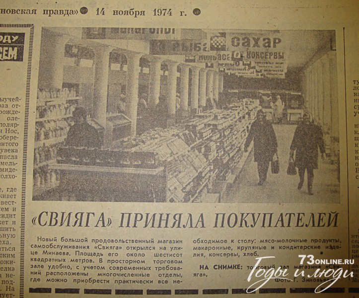 Новый большой продовольственный магазин самообслуживания «Свияга» открылся на улице Минаева. Площадь его около шестисот квадратных метров. В просторном торговом зале удобно, с учетом современных требований расположены многочисленные отделы, где можно приобрести практически все необходимое к столу: мясо-молочные продукты, макаронные, крупяные и кондитерские изделия, консервы, хлеб.
