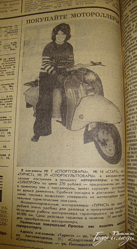 В магазины № 7 «Спорт-товары», № 14 «Старт», № 16 «Турист», № 39 «Спорт-культовары» к весенне-летнему сезону поступили в продажу мотороллеры: в том числе «Электрон» по цене 270 рублей – предназначен для езды в одиночку или с пассажиром, имеет хорошую устойчивость во время движения (...)