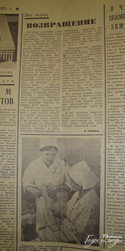 Конечно, он не хотел умирать и мечтал вернуться домой, в свой поселок, колхоз, в котором председательствовал пять лет перед войной. И он вернулся сюда, только с опозданием на тридцать с лишним лет. Когда в Ульяновскую область в Мор-Карагужу пришло письмо из Ленинграда, собрались все родственники Ханова и решили похоронить его прах на кладбище поселка Красный Октябрь. За ним поехали вдова и сестра, две дочери, сын и зять.