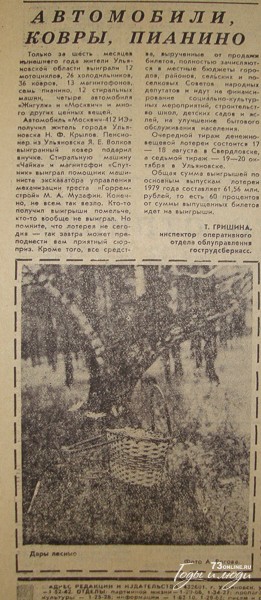 Автомобиль «Москвич-412 ИЭ» получил житель города Ульяновска Н.Ф. Крылов. Пенсионер из Ульяновска Я.Е. Волков выигранный ковер подарил внучке. Стиральную машину «Чайка» и магнитофон «Спутник» выиграл помощник машиниста экскаватора управления механизации треста «Горремстрой» М.А. Музафин. Конечно, не всем так везло. Кто-то получил выигрыши помельче, кто-то вообще не выиграл. Но помните, что лотерея не сегодня – так завтра может преподнести вам приятный сюрприз. Кроме того, все средства, вырученные от продажи билетов, полностью зачисляются в местные бюджеты городов, районов, сельских и поселковых Советов народных депутатов и идут на финансирование социально-культурных мероприятий, строительство школ, детских садов и яслей, на улучшение бытового обслуживания населения.