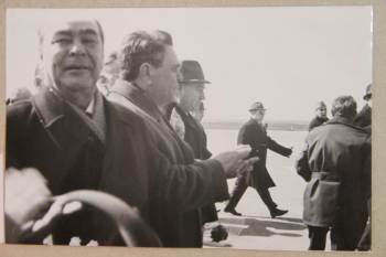 Л.И. Брежнева встречают участвующий в Международной встрече представителей рабочего и профсоюзного движения в Ульяновске член Политбюро ЦК КПСС, председатель ВЦСПС А.Н. Шелепин, член ЦК КПСС, первый секретарь областного комитета партии А.А. Скочилов, председатель исполкома областного Совета депутатов трудящихся В.П. Васильев, секретари обкома КПСС М.Н. Козлов, В.А. Полянсков, Е.В. Сазанов, В.Н. Сверкалов, первый секретарь Ульяновского горкома КПСС А.И. Кудрявцев, члены и кандидаты в члены бюро обкома КПСС, члены облисполкома, председатель исполкома Ульяновского горсовета Б.А. Ланцов и другие товарищи (...)