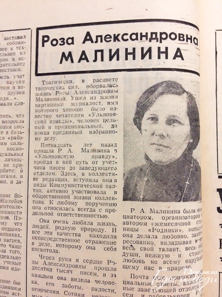 Трагически, в расцвете творческих сил, оборвалась жизнь Розы Александровны Малининой. Ушел из жизни партийный журналист, имя которого хорошо было известно читателям «Ульяновской правды», человек цельный и принципиальный, до конца преданный избранному делу. (…)