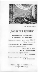 - «Поднятая целина» Шолохова рассказывает о событиях тридцатилетней давности, но роман и сегодня глубоко современен, ибо в нем мы видим, как формируется психология и характер нового советского человека. Историческая конкретность изображения рождает ощущение перспективы. Именно этими качествами и руководствовался театр, включив в свой репертуар «Поднятую целину» (…)