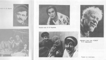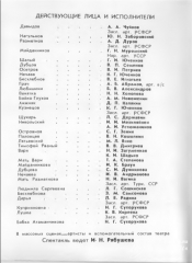В этом спектакле заняты: народный артист УССР Г. Юченков, заслуженные артисты РСФСР Н. Сухорукова, П. Басов, С. Ежков, артисты А. Чуйков, Ю. Заборовский, А Дуров, В. Колошкин, Г. Муромский, В. Арлахов, В. Аполлонов, Л. Радина, С. Герасимова, И. Браун, С. Зенин, В. Светличный, В. Нужный, В. Хоркин и другие.
