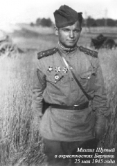 Шутый Михаил Александрович, 1924 года рождения. После Сызранской пиротехнической школы в начале 1943-го добровольцем пошёл на фронт. Был командиром огневого взвода и командиром батареи 76- и 45-миллиметровых орудий. Боевые награды: орден Красной Звезды, ордена Отечественной войны I и II степеней, медали за взятие Варшавы, Берлина и за победу над Германией. Михаил Александрович умер 30 октября 2009 года. Его воспоминания записал сын, Анатолий Шутый, и сопроводил рассказ отца своими стихами.