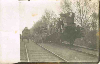 Бронепоезд стоял под прикрытием холма, в лощине. Возле первой бронеплощадки собрались бойцы. Некоторые стоят, другие присели на траву. Усталые, изможденные и суровые лица: каждый понимает, что подходит конец… Мы заняли круговую оборону, отбивались от наседавших врагов. Рядом с нами — взорванный мост, широкая Волга... С каждым часом усиливается угроза захвата бронепоезда белыми. Совместно с Самокишем, Васильевым, Гимельштейном, Кравчуком принимаем решение: уничтожить его. В молчании снимаем замки орудий, разбираем пулеметы. Пустеют вагоны и бронеплощадки. Зову Селецкого: