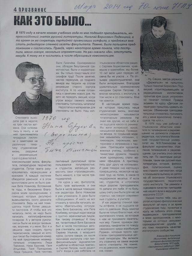 - В печати я писала. В «Ульяновском комсомольце», писала заметки в «Ульяновскую правду». Но когда встретилась с Аллой Багдасаровой, то вся душа моя прикипела к радио. Но и на телевидении у меня тоже были программы –– «Завод и Люди», «Край текстильный». Тогда в области было 15 фабрик. Такой могучий был комбинат! Это был круг моего общения - рабочие, строители, ткачихи. Вот так сложился мой круг, и главным был человек труда.