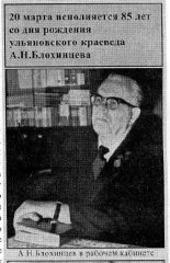 Имя Александра Николаевича Блохинцева хорошо знают и помнят ульяновцы. Он был увлеченным краеведом-исследователем. Им написано более ста статей по истории родного края, опубликованных в местной и центральной печати. Блохинцев открывал и вводил в наше краеведение многие новые имена. Результатом многолетних исследований краеведа стала брошюра "Симбирск 18 в.", а также книга "И жизни след оставили своей". Она вышла двумя изданиями в 1980 г. и в 1985 г. Оба издания сразу же стали библиографической редкостью. Во втором издании книги 224 страницы, 30 очерков, 576 примечаний, в именном указателе 515 имен. Огромный труд! Недаром рецензент книги, кандидат исторических наук, краевед С.Л. Сытин писал А.Н. Блохинцеву: «Поздравляю со вторым издание Вашей прекрасной книги! Удовлетворение от Вашей прекрасной книги всеобщее!"