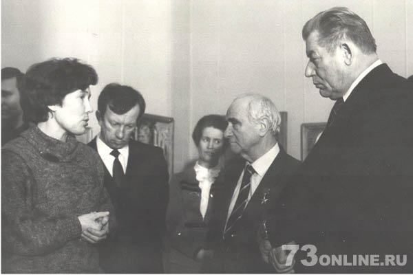 1-ый секретарь Ульяновского обкома КПСС Геннадий Васильевич Колбин ( на переднем плане 1-ый справа) в группе участников торжественного мероприятия, посвя-щённого 93-летию со дня рождения Народного художника СССР Аркадия Александровича Пластова в Художественном музее г. Ульяновска. 31 января 1986 г Ульяновск.